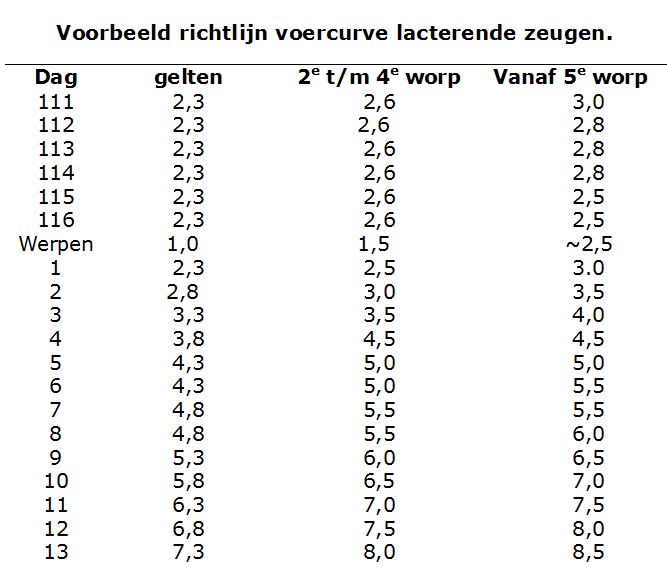 Hiernaast zie je een voerschema voor het einde van de dracht en als de zeug geworpen heeft.